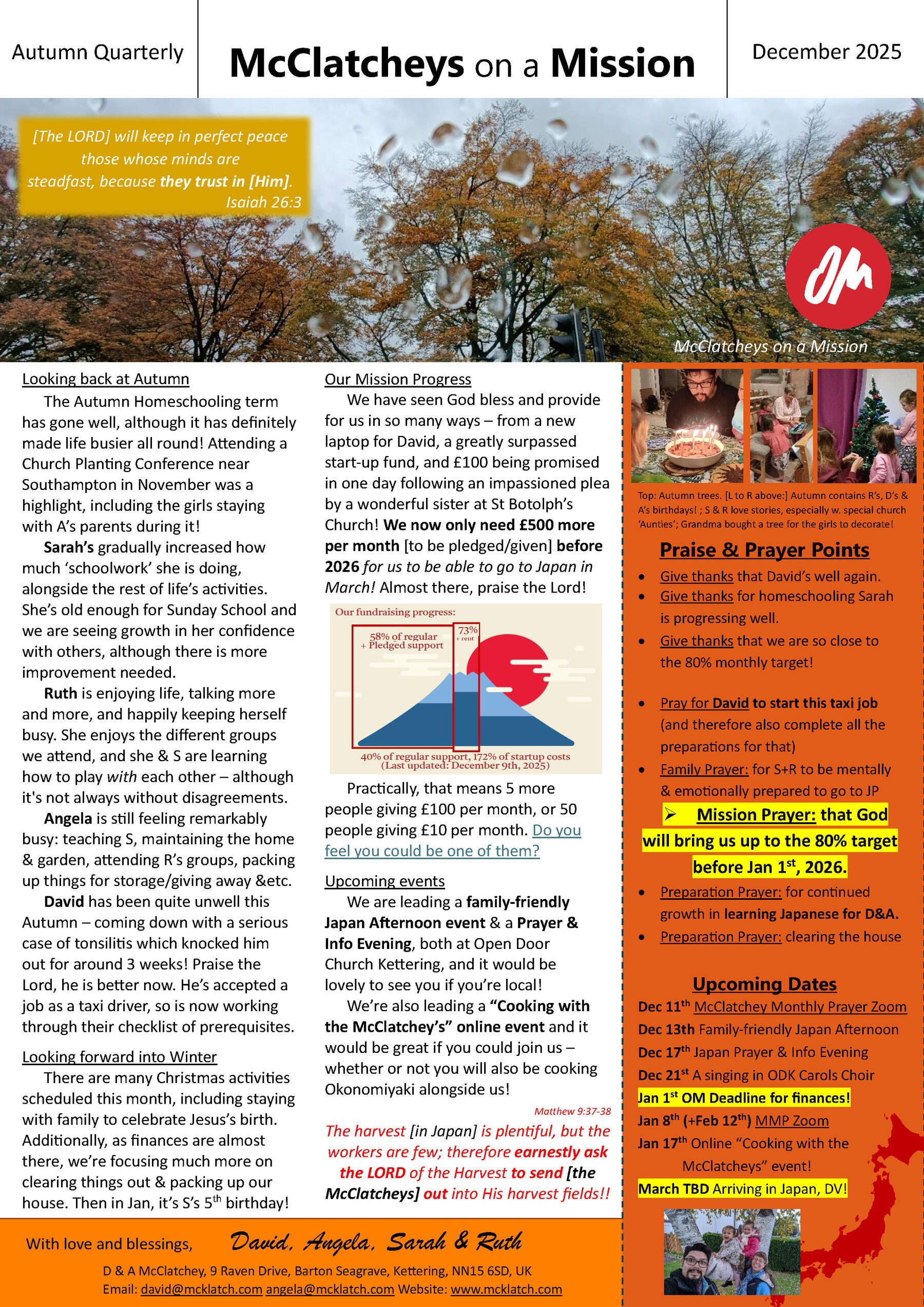 Prayer Newsletters: We are committed to producing regular [online] newsletters, and you can subscribe for Monthly emails, Quarterly emails or Annual emails on this website.WhatsApp group: We also have a Prayer & Updates WhatsApp group [where only David & Angela can post], for those interested in following our journey more closely and praying as requests arise.Zoom Prayer Meeting: On the 2nd Thursday every month, we lead a 30-minute Zoom Prayer Meeting, where we share updates and pray for our needs & for Japan herself. Email us to find out the timings and details so that you can join us in praying (silently or out loud).